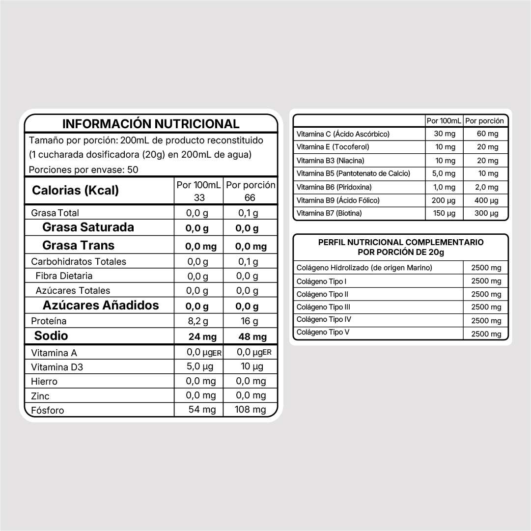 Proteína aislada de suero, Colágeno Hidrolizado (de origen marino), Colágeno Tipo I, II, III, IV y V, Resveratrol, Fosfato Tricálcico, Sabor ídentico al natural, CMC (Estabilizante), Dióxido de Ttitanio, Vitamina C, Vitamina E, Vitamina B3, Colorante, Benzoato de Sodio, Vitamina B5, Vitamina B6, Vitamina B9, Vitamina B7 y Vitamina D3.