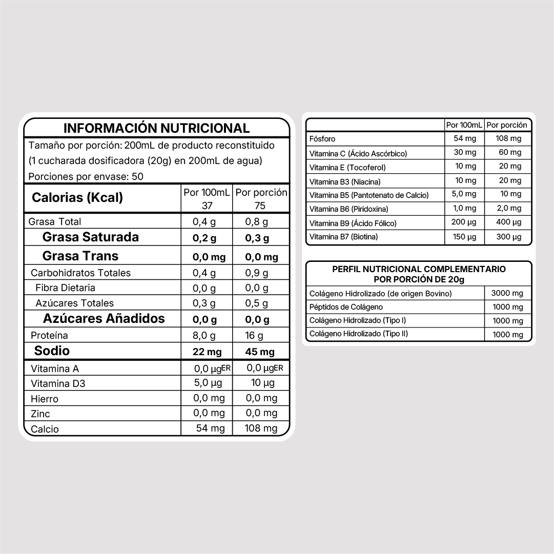 Proteína de suero, Colágeno Hidrolizado, Péptidos de colágeno, Colágeno Tipo I, Colágeno Tipo II, Fósfato Tricálcico, Cloruro de Magnesio, Sabor ídentico al natural, CMC (Estabilizante), Dióxido de Ttitanio, Vitamina C, Vitamina E, Vitamina B3, Colorante, Benzoato de Sodio, Vitamina B5, Vitamina B6, Vitamina B9, Vitamina B7 y Vitamina D3.